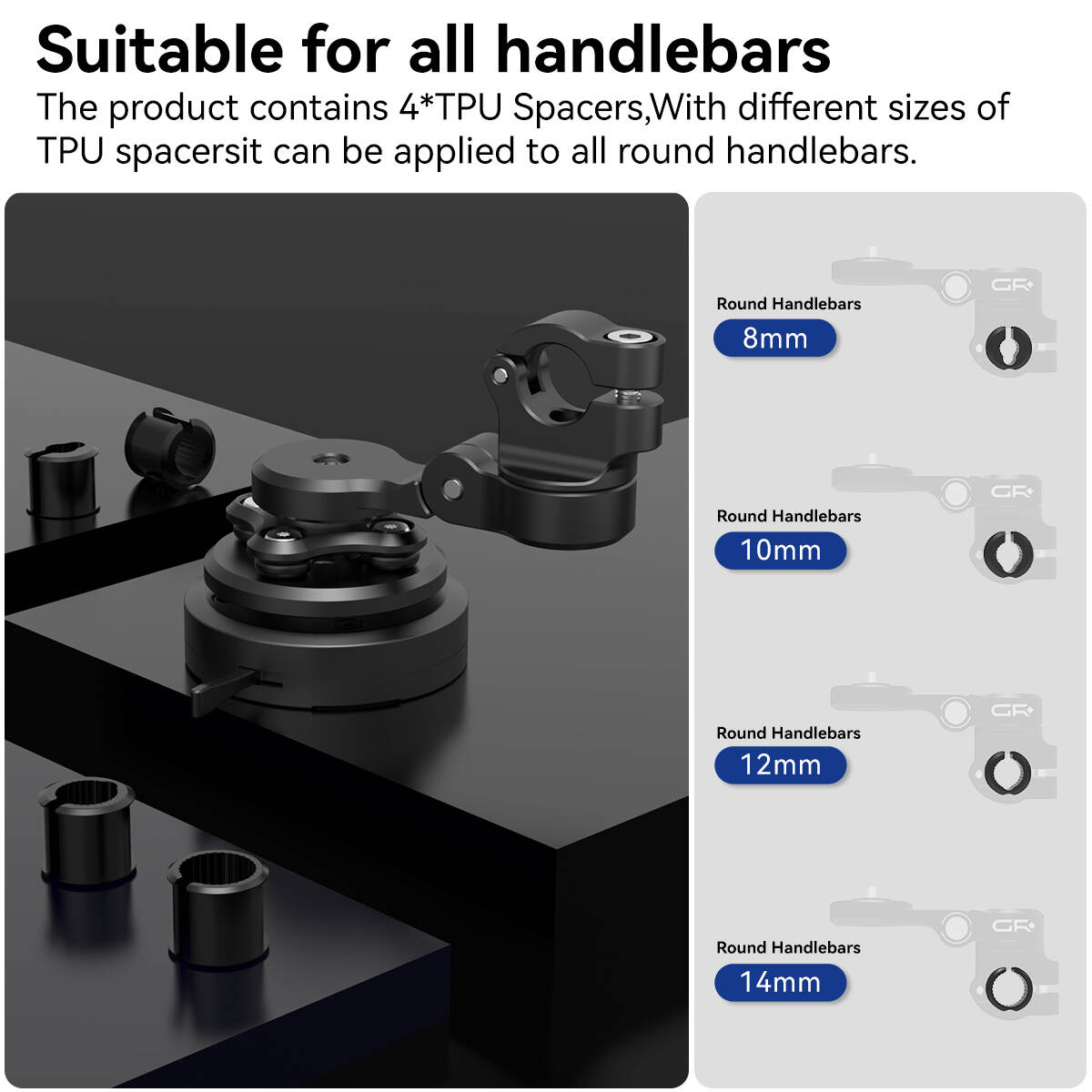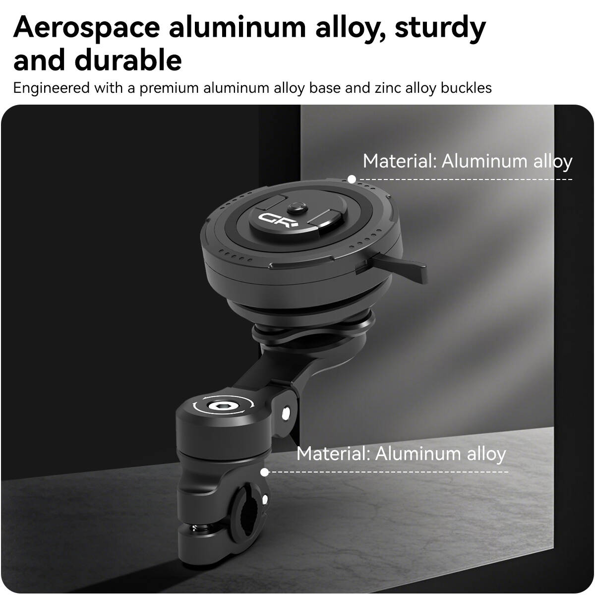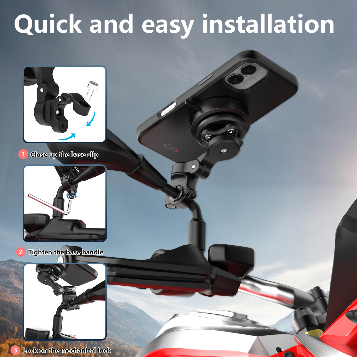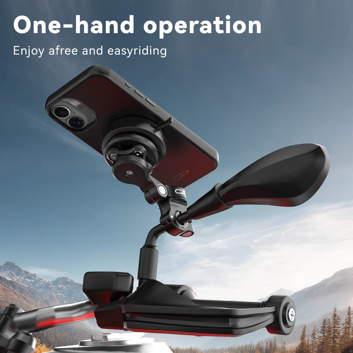· 1-Sekunden-Einhand-Schnellverschluss, magnetische automatische Ausrichtung, Doppelverriegelung. · Schnellspannkern mit 360°-Drehung, Halterung lässt sich horizontal um 3609° und vertikal um 0–140° verstellen. · Mit Metallvibrationsdämpfer PRO und Spiegelvorbau-Montagesockel. · Kompatibilität mit 8-14-mm-Spiegelstielen. · Universelle Schnittstelle. · Erfindungspatent.