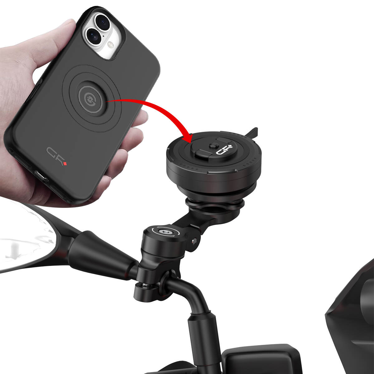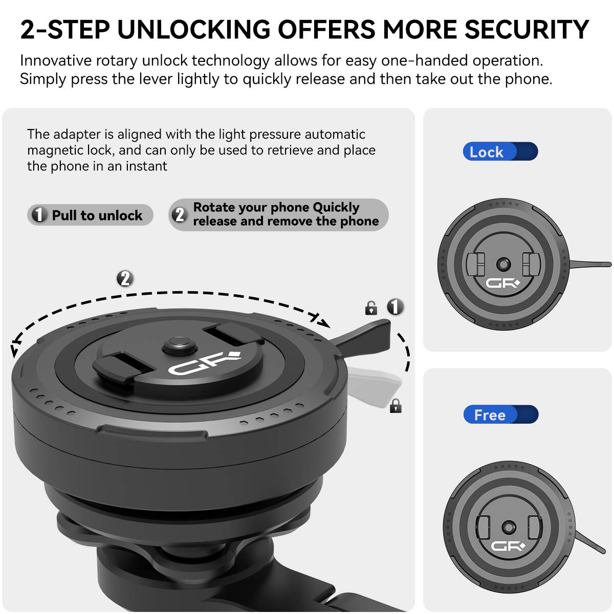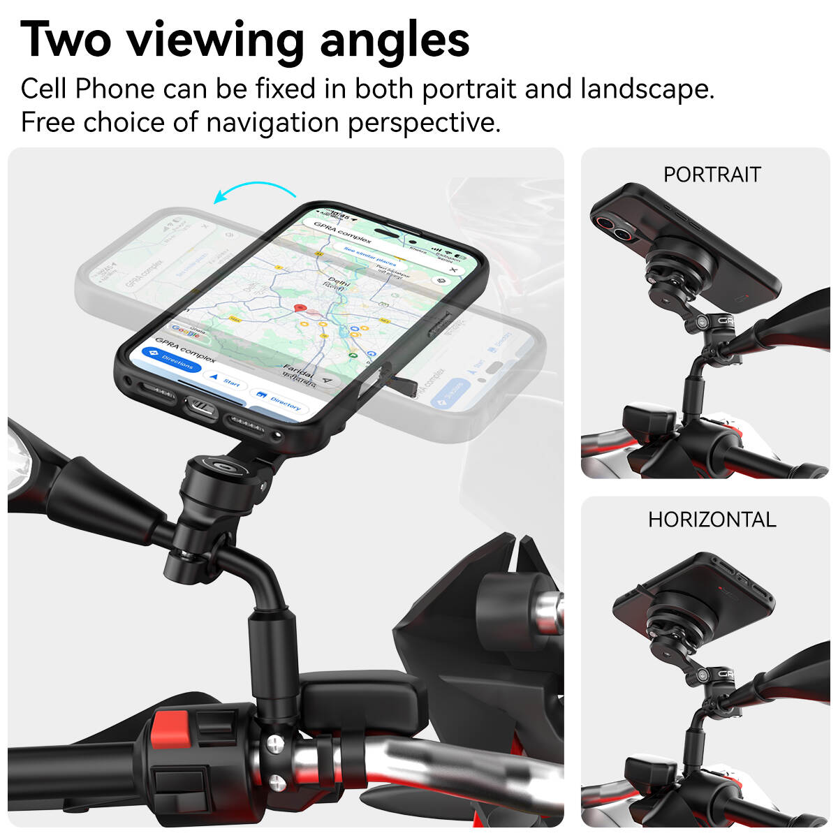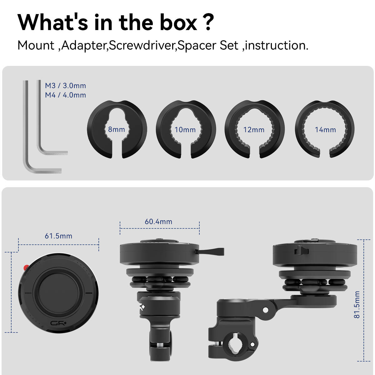 · 1-Sekunden-Einhand-Schnellverschluss, magnetische automatische Ausrichtung, Doppelverriegelung. · Schnellspannkern mit 360°-Drehung, Halterung lässt sich horizontal um 3609° und vertikal um 0–140° verstellen. · Mit Metallvibrationsdämpfer PRO und Spiegelvorbau-Montagesockel. · Kompatibilität mit 8-14-mm-Spiegelstielen. · Universelle Schnittstelle. · Erfindungspatent.